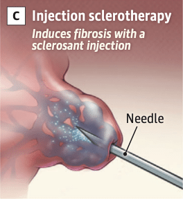 Een alternatief op bovenstaande behandeling is het zogeheten scleroseren, hierbij wordt met een dunne naald een speciale vloeistof in de aambei gespoten waardoor deze verschrompelt en naar binnen trekt. De literatuur laat zien dat deze behandeling iets minder effectief is dan rubberbandligatie echter is een mogelijk voordeel dat er direct na de behandeling iets minder ongemak wordt beschreven. We vinden het bij Tulp Medisch Centrum belangrijk om alle effectieve behandeling in ons palet te hebben derhalve voeren onze chirurgen deze behandeling indien gewenst ook uit.